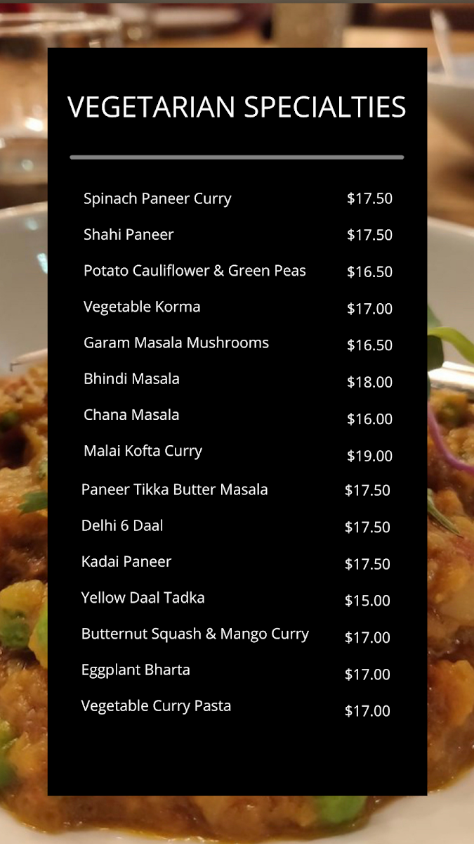 The menu at Delhi-6 is a treasure trove of flavors, with vegetarian specialties like the fragrant Mushroom Masala and the oh-so-satisfying Shahi Paneer at CA$18.75, which is brimming with creamy richness. If you’re in the mood for something truly unique, don’t miss the Butternut Squash and Mango Curry—a harmonious blend of sweet and savory notes at just CA$18.75. For seafood lovers, the Mango Prawn Curry (CA$29.00) is a must-try, perfectly cooked with a luscious coconut base that sings with the taste of summer.